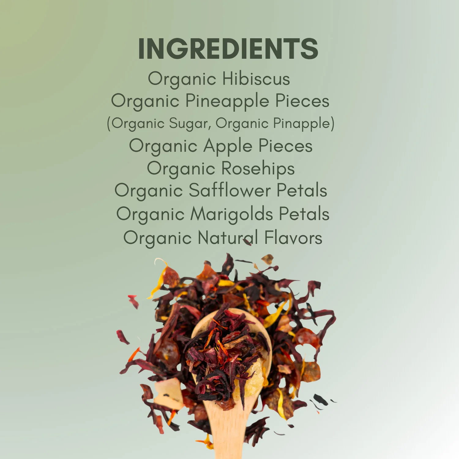 An herbal blend that is edible! Organic Hibiscus, Pineapple, Apple, Rosehips, Safflower, Marigold and natural fruit flavors create the perfect combination. Tangy and sweet! Rich in flavor and color, this tea will make your mouth water and your taste buds jump!